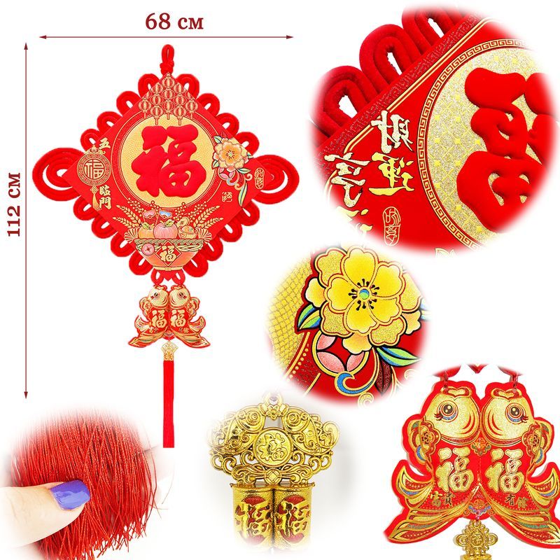 Традиционный китайский узел в форме ромба с символичным дизайном. Яркое сочетание красного бархата и золотых элементов создает эффектный акцент в интерьере.