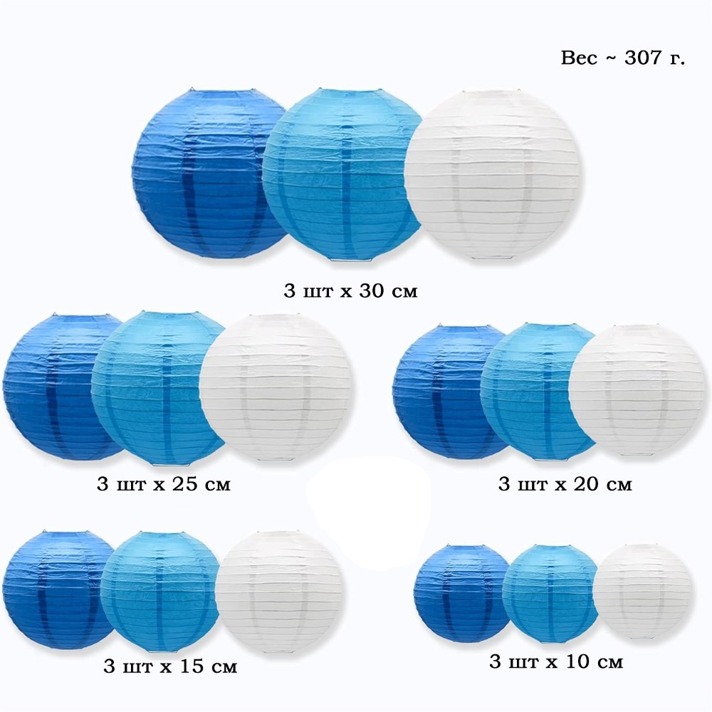 Набор подвесные фонарики 15 шт, белый+синий+т.синий
