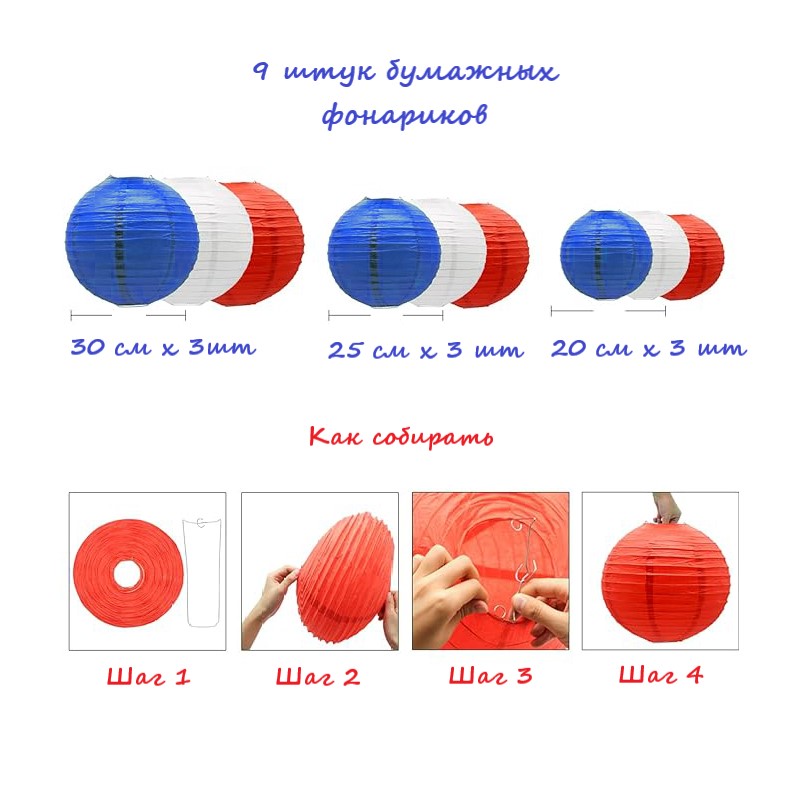Набор подвесные фонарики 9 шт, белый+красный+т.синий