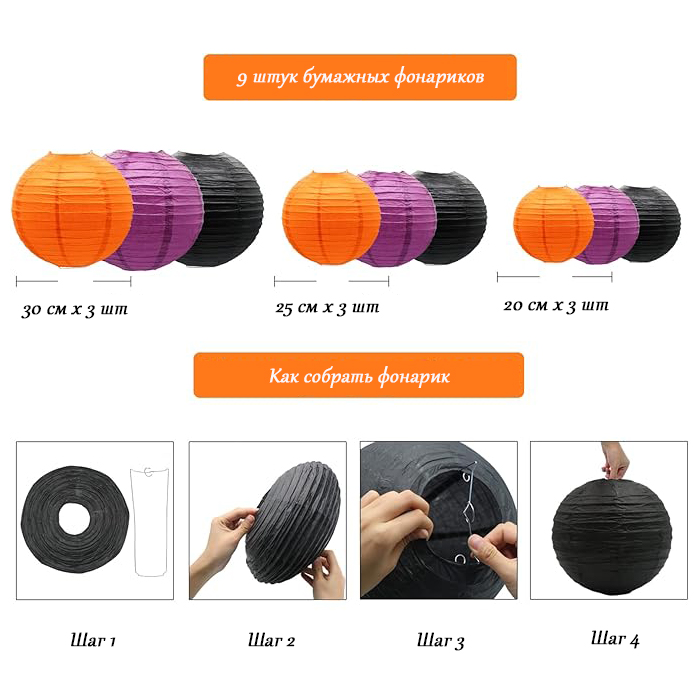 Набор подвесные фонарики 9 шт, сиреневый+черный+оранжевый