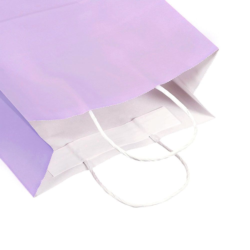 Подарочный пакет из крафтовой бумаги пастельного оттенка с белыми бумажными ручками и белой внутренней стороной.
