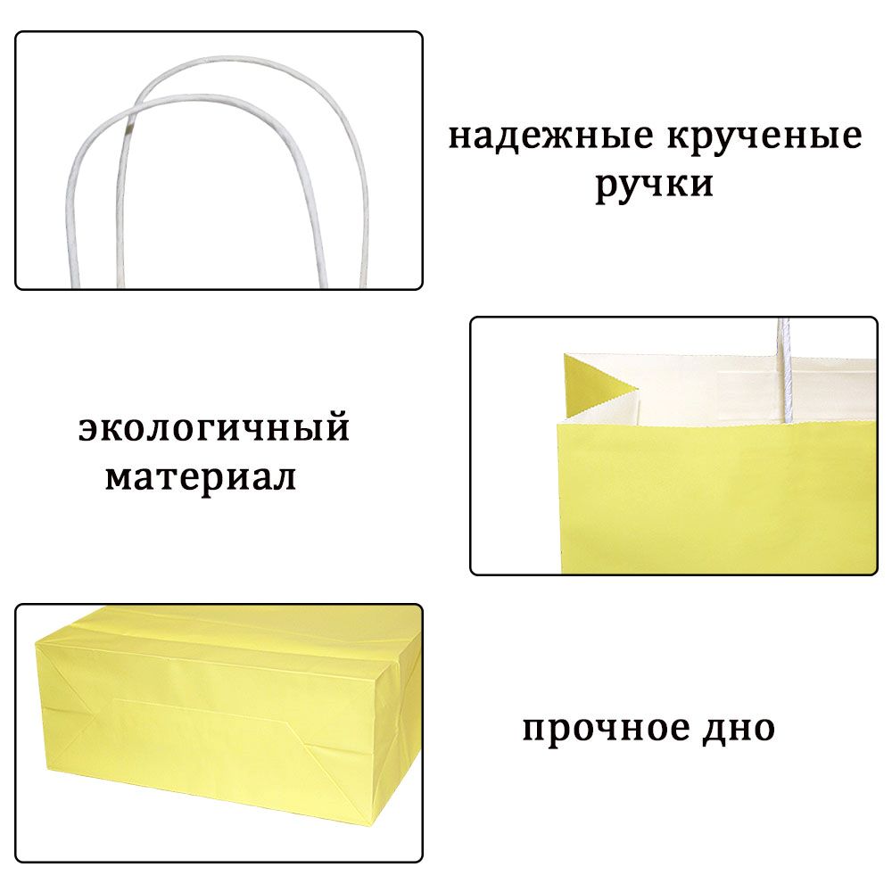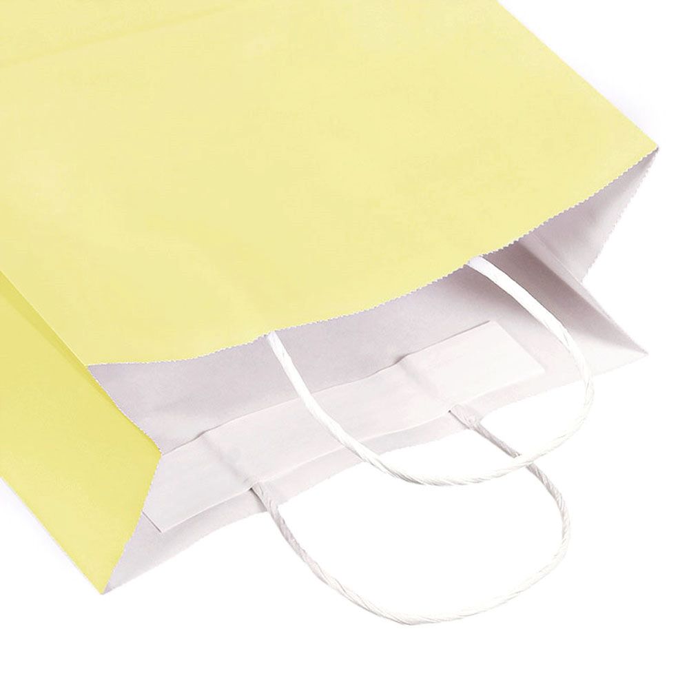 Подарочный пакет из крафтовой бумаги пастельного оттенка с белыми бумажными ручками и белой внутренней стороной.