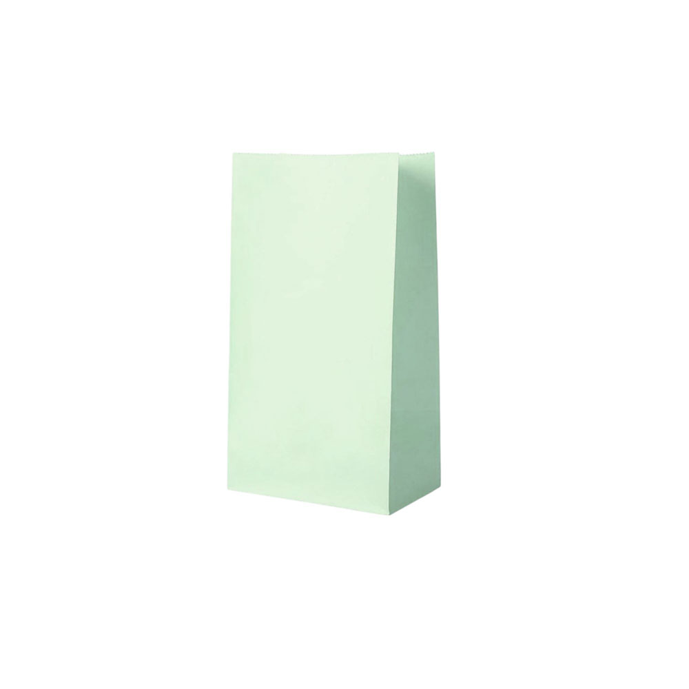 Подарочный пакет из крафтовой бумаги пастельного оттенка с белыми бумажными ручками и белой внутренней стороной.
