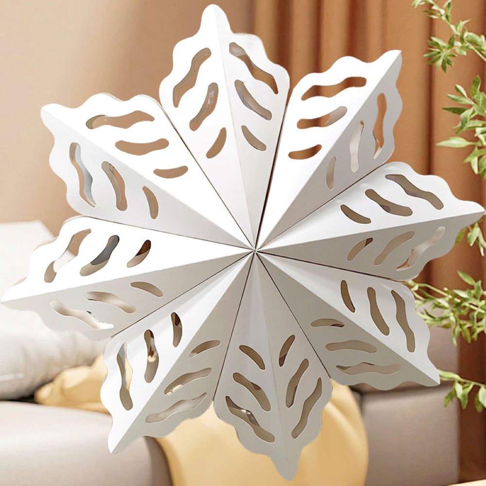 Элегантная объёмная снежинка из плотной бумаги белого цвета — изысканное украшение для зимнего интерьера, витрин, залов и новогодних фотозон. Ажурный рисунок придаёт ей лёгкость и воздушность, создавая ощущение снежной свежести и уюта.