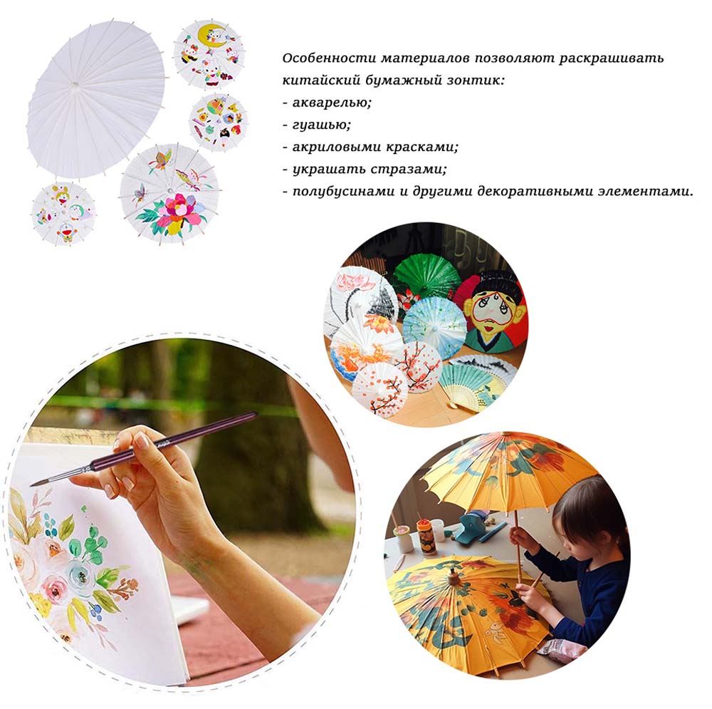 Особенности материалов позволяют раскрашивать китайский бумажный зонтик акварелью, гуашью, акриловыми красками, украшать стразами, полу бусинами и другими декоративными элементами.